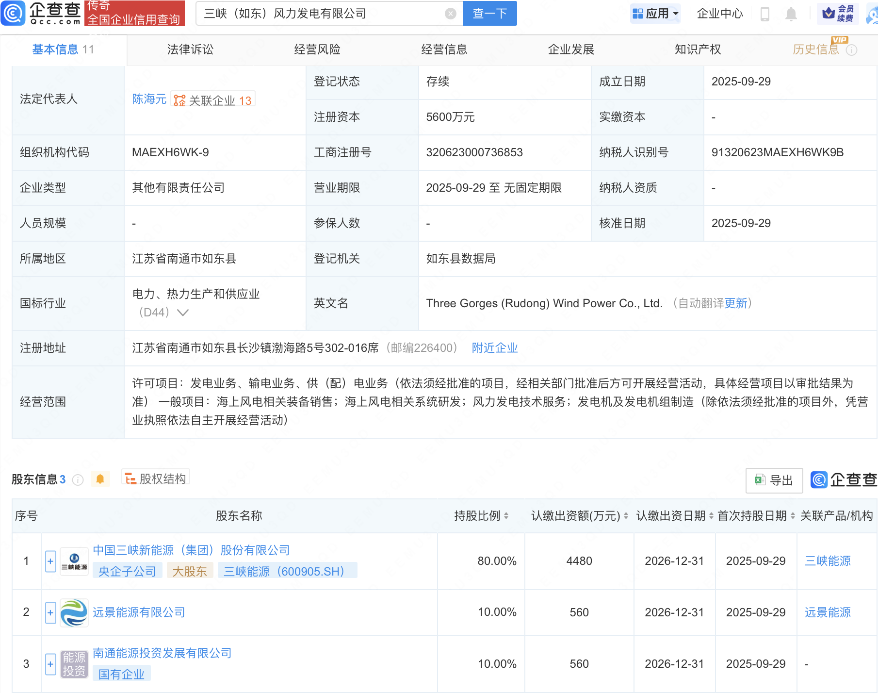 近日,三峡(如东)风力发电有限公司成立,注册资本5600万元,经营范围包含:海上风电相关装备销售;海上风电相关系统研发;风力发电技术服务;发电机及发电机组制造等。企查查股权穿透显示,该公司由三峡能源(600905)、远景能源有限公司等共同持股。