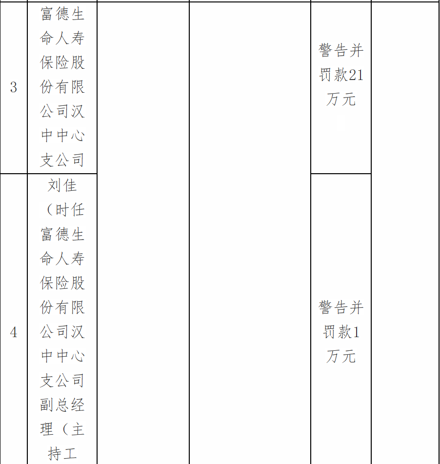 10月9日,国家金融监督管理总局汉中监管分局行政处罚信息公示表显示,富德生命人寿保险股份有限公司汉中中心支公司因财务凭证记载事项与实际用途不符、直销业务虚挂代理人套取佣金、代理人存在销售误导行为被警告并罚款21万元;相关责任人刘某被警告并罚款1万元,易某被警告并罚款1万元,汪某被警告并罚款2000元。